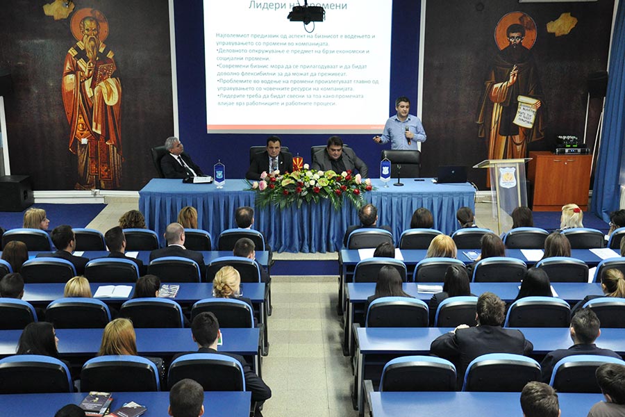 Visiting lecturers have presented themselves first Vice Rector for Teaching at the University of Tourism and Management, Mijalce Georgievski PhD, and Vice Rector for International Cooperation Zoran Ivanovski PhD. Followed the adviser of market analysis Vladimir Ristovski started his lecture with a previous and well outlined presentation of the topic. In his address to the students first defined the term leadership, or what it means and what kind of leadership and leaders there, but at the same time explaining the factors that influence the style of leadership . According to him a successful leader is one who has the ability to give directions to the others, but even more is the one that has the ability to persuade people to take action. While not excluding the fact that there are leaders who simply have an innatiate charisma to it, however, by Ristovski, leader is not born, but is created through learned theory and practice through the respective years. For this claim he pointed a few examples of people who now apply for leaders and successful managers in the world.