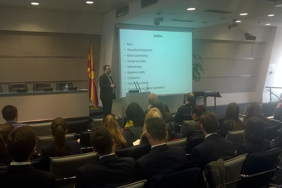 Презентирањето на трудовите го започна господинот Гани Рамадани кој посочи дека неговиот труд со наслов: „Wage and Price Settings in Macedonia: Evidence from Survey Data" претставува истражување за врската помеѓу платите и цените во Република Македонија и како кризата влијаела врз активностите на фирмите. Притоа тој наведе дека главната цел на неговиот труд е насочена кон идентификување на релевантни каракеристики за платите и цените во Република Македонија, врската помеѓу нив и што би се случило доколку се појават непланирани токови во економијата. По неговото завршување, со презентирање настапи господинот Рилинд Кабаши, кој посочи дека неговиот труд со наслов "The Cyclical Character and Determinants of Fiscal Policy in Old, New and Prospective EU Member States" има три цели и тоа: да се анализира емпириски цикличниот карактер на фискалната политика во старите, новите и потенцијалните земји членки на ЕУ, да се истражат дополнителни детерминанти во цикличната економија и да се најдат разликите во детерминантите во цикличната економија.