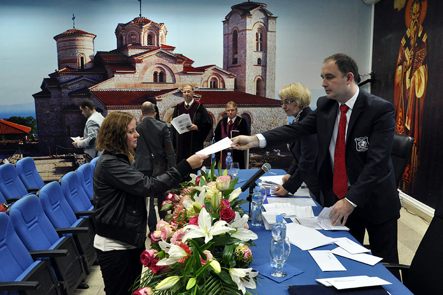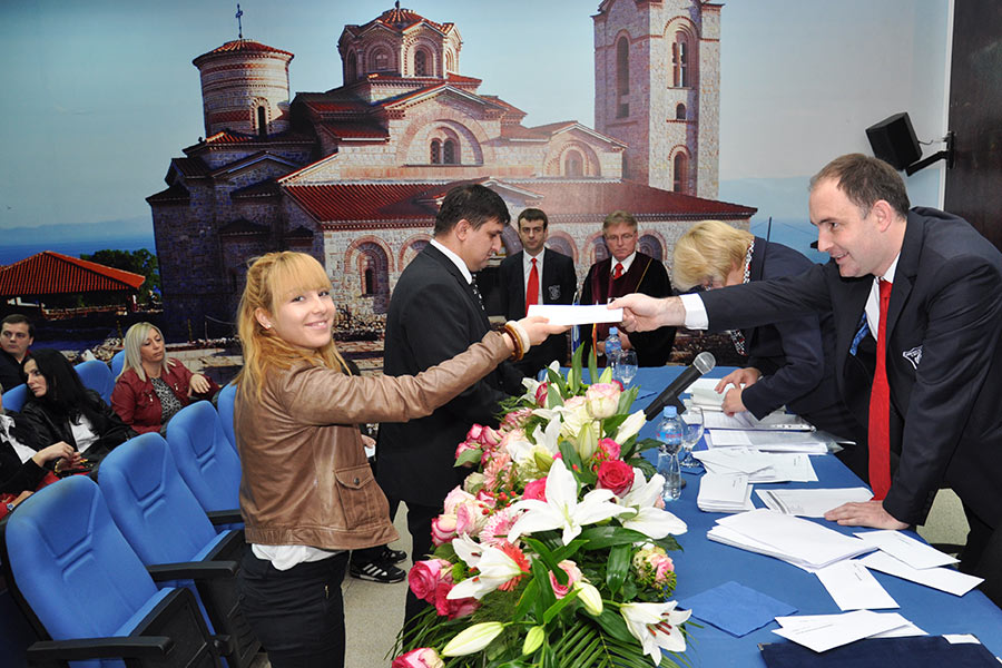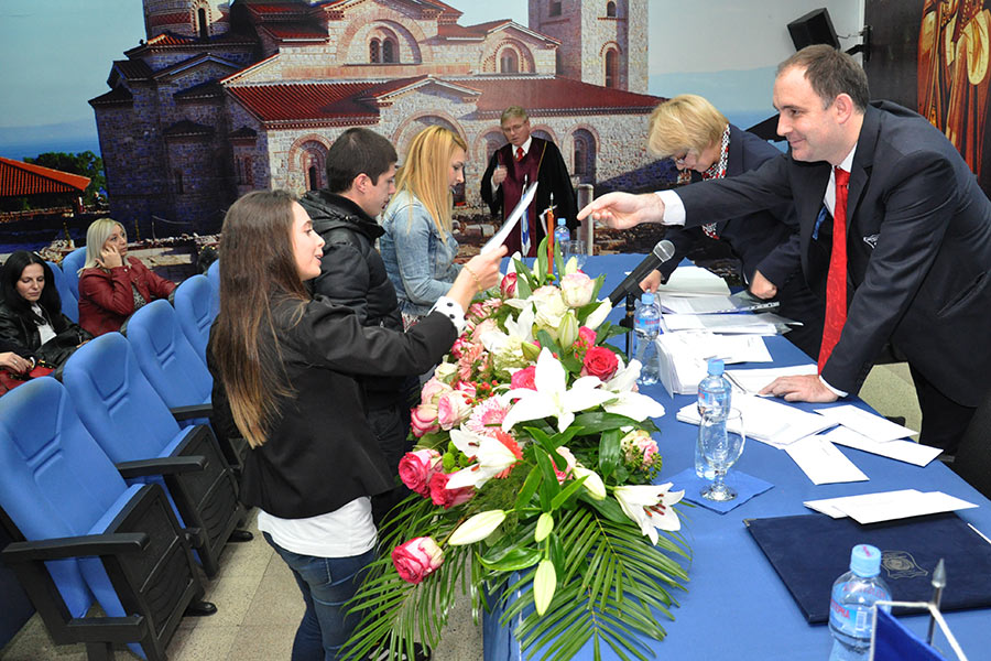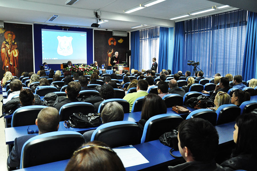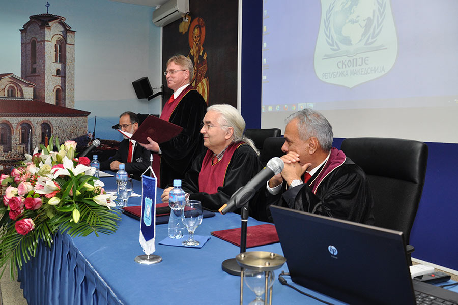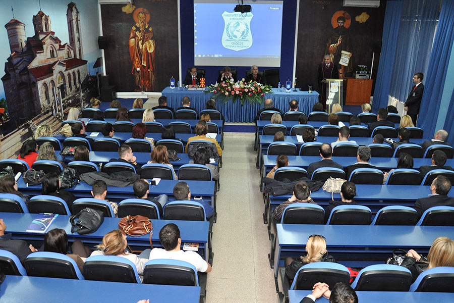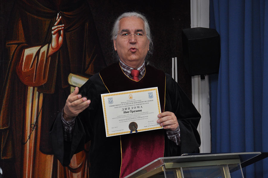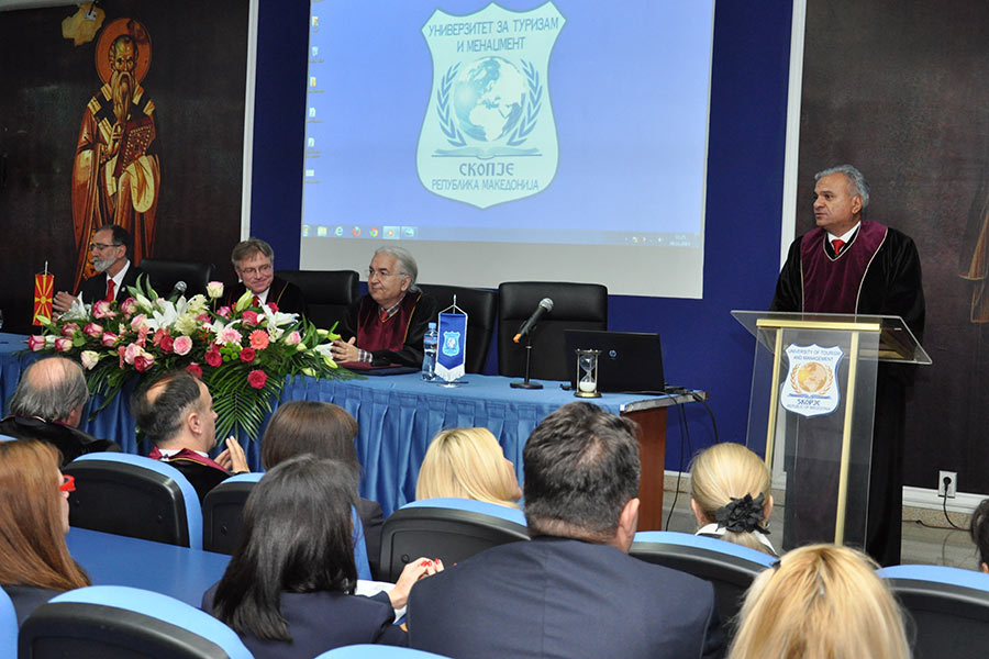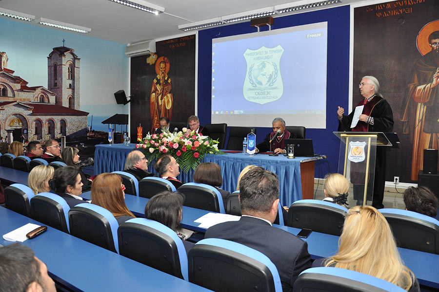 Во преполната сала во Амфитеатарот на Универзитетот, каде беа присутни над 150 постдипломци, од името на Ректорот на Универзитетот за туризам и менаџмент Проф. Д-р Аце Миленковски, на присутните најнапред им се обрати Проректорот за наука при УТМС, Проф. Д-р Сашо Кожухаров, кој говореше за историјатот на Универзитетот, при тоа поединечно преставувајќи ги сите седум Факултети, кои функционираат во рамките на УТМС, вклучително и дисперзираните Центри кои ги има овој Универзитет во Св. Николе, Крушево, Ресен, Гостивар и Велес. Истовремено, Професорот Кожухаров го презентираше и Меѓународното научно списание „UTMS Journal of Economics“,кое како што рече е влезено во 14 светски бази на податоци со импакт фактор.
