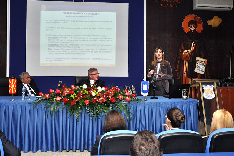 Вицегувернерката Ангеловска-Бежовска пред студентите на УТМС говореше на повеќе теми, опфаќајќи ги областите на монетарната политика, истражување и статистика, која во своето исрпно излагање, ги опфатаи сегментите на процесот на макроекономски проекции и донесување на монетарни одлуки, кои сеодвиваат низ повеќе чекори. Тргнувајќи од дефинирањето на основните егзогени претпоставки на проекциите економскиот раст и инфлацијата на најзначајните трговски партнери, преку цените на примарните производи, па се до подготовката на проекциите за Република Македонија, односно нејзиниот економскиот раст, инфлацијата, платниот биланс и монетарниот сектор. Во опсегот на нејзината презентација се најде и подготовка на Кварталниот извештај со објаснување на клучните претпоставки, проекциите, отстапувањето во однос на претходниот циклус на проекции како и ризиците за проекциите.