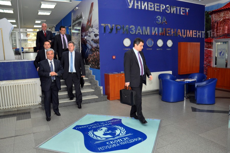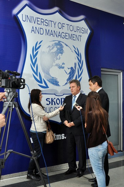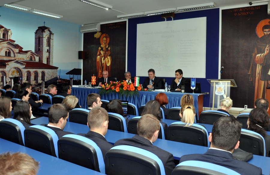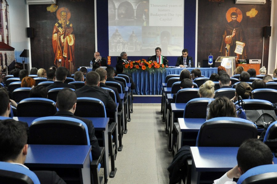 Од името на Ректорот на Универзитетот за туризам и менаџмент Проф. Д-р Аце Миленковски, делегацијата од унагарската амбасада ја поздравија Проректорот за меѓународна соработка Проф. Д-р Зоран Ивановски и професорот Димитар Бојаџиески, кои истакнаа дека нивното присуство на Универзитетот за туризам и менаџмент од Скопје е од особено значење за студентите, бидејќи со ова предавање имаа можност да добијат комплетна слика за Унгарија.