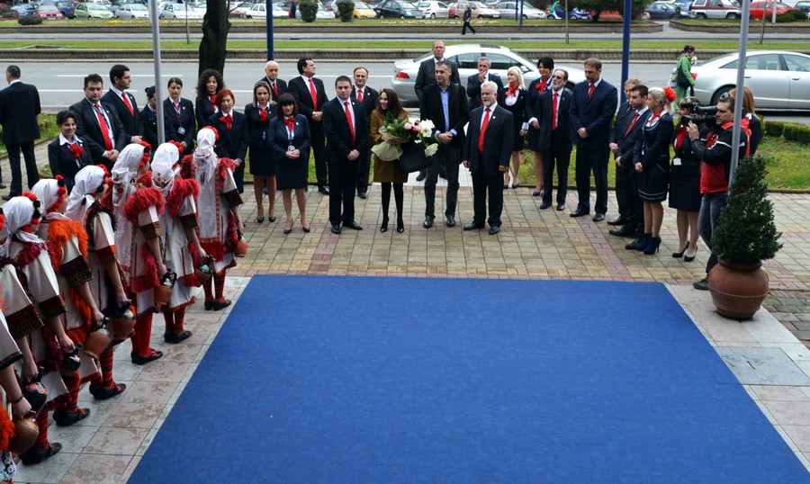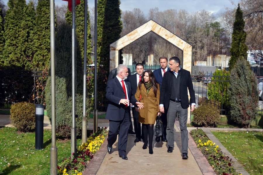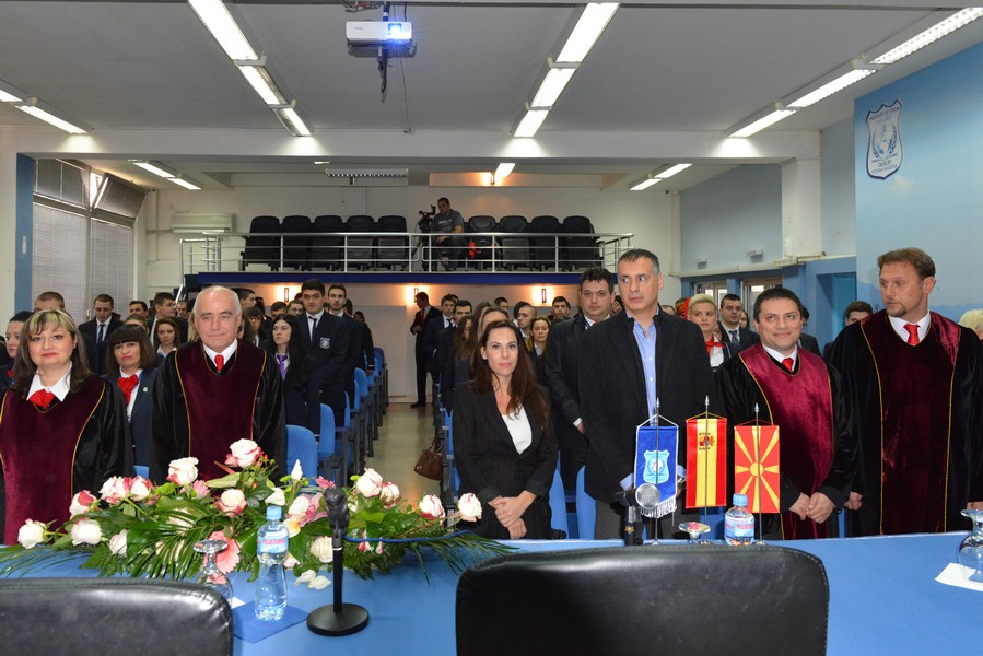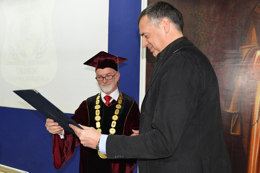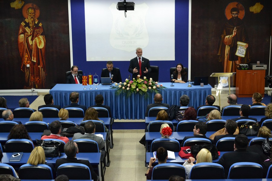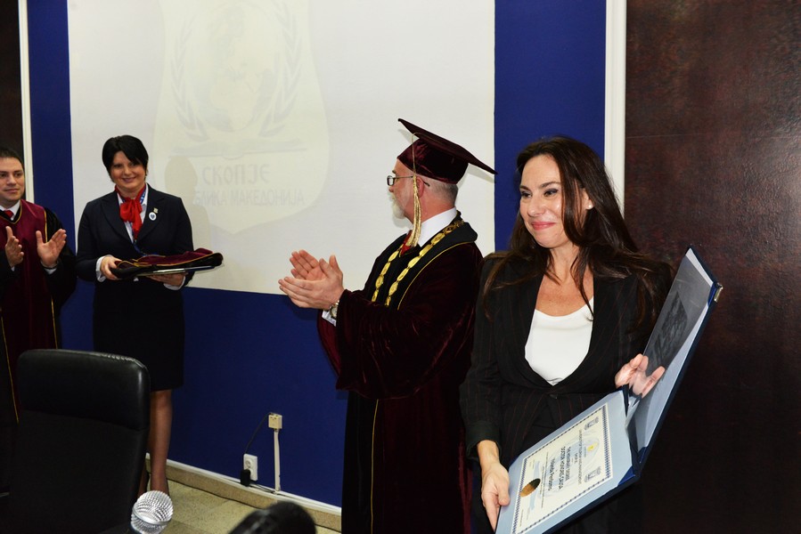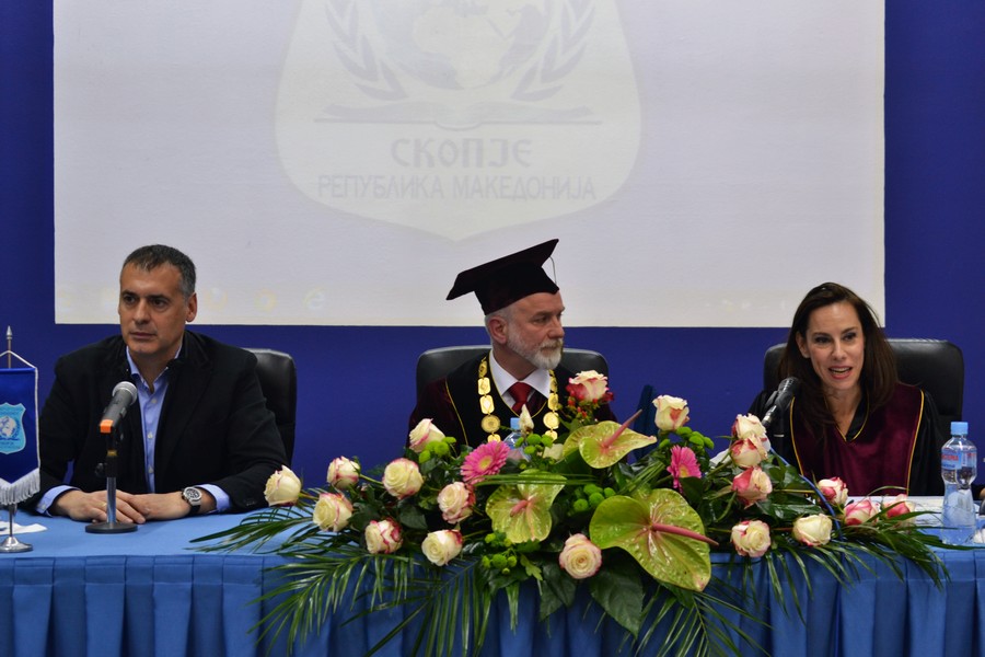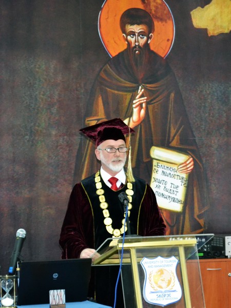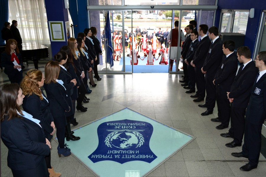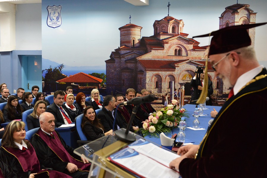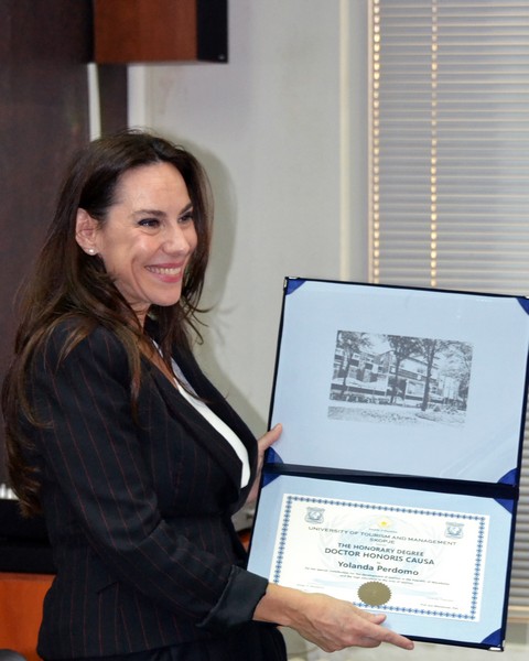 0105Извршниот директор на придружните членки на UNWTO г-ѓа Јоланда Пердомо и г-динот Хозе Гонзалез Ривера, пред Универзитетот за туризам и менаџмент во Скопје, беа пречекани на традиционален македонски начин, по што следуваа разговори на Ректорот на УТМС Д-р Аце Миленковски и Деканот на Факултетот за туризам Д-р Сашко Граматниковски, со делегацијата од UNWTO. На средбата главно беше разговарано за двата потенцијални проекти „Ски Центар Водно“, и „Матка“ , кои ги образложи Ректорот Миленковски, објаснувајки ги потенцијалите на овие локации во согласност со веќе договореното вклучување на некој капацитет од Македонија во проектите на придружните членки на UNWTO. Г-ѓа Пердомо и г-дин Ривера изразија задоволство што се избрани токму овие локации и изнесоа низа предлози во насока на почнување на реализацијата на проектот. Веднаш потоа, во чест на извонредната соработка што УТМС ја има со Светската туристичка организација на Обединетите Нации, во просториите на УТМС, со присуство на целокупниот наставен кадар на Универзитетот, беше одржана свечена седница, на која на Извршната директорка на придружните членки на UNWTO, г-ѓа Јоланда Пердомо и беше доделена титулата DOCTOR HONORIS CAUSA, додека на г-динот Хозе Ривера му беше доделена посебна благодарница.