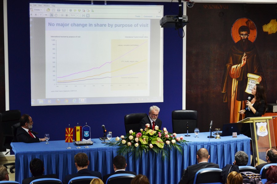 1106-6Посетата на високите гости од UNWTO, беше ретка прилика и да се слушнат нови идеји и насоки за развојот на туризмот во светот и тоа од едни од најелитните експерти од оваа област. За таа цел беше и организирано предавањето на УТМС. Извршната директорка на придружните членки на Светската туристичка организацијана Обединетите Нации,Јоланда Пердомо, во своето излагање истакна дека 2012 година ќе остане запаметена по тоа што за прв пат бројот на интернационални туристи во светот ја надминал бројката од една милијарда. Се покажа, рече таа, дека туризмот е гранка која и покрај сите економски и политички кризи, но и природни катастрофи, е во постојан пораст. Туризмот ја поттикнува културната интеракција, меѓусебното разбирање и претставува цврста основа за воспоставување на светскиот мир.