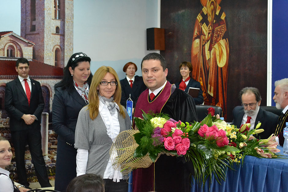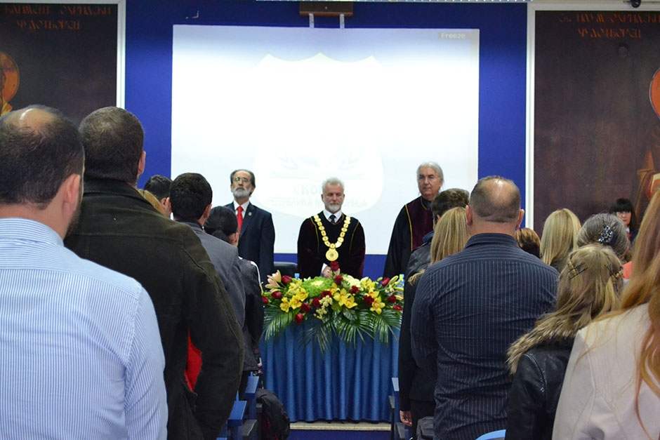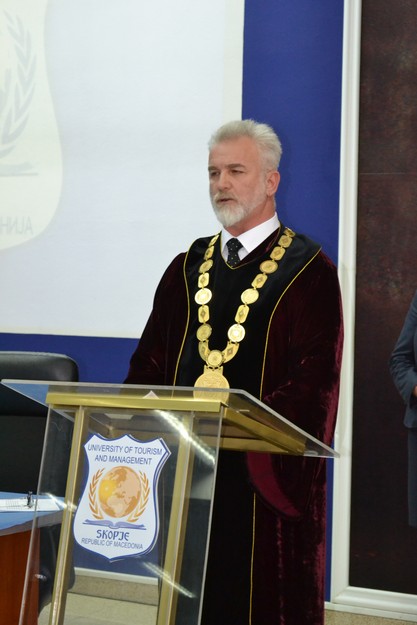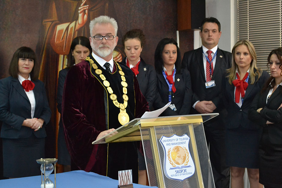 Во преполната сала во Амфитеатарот на Универзитетот, каде беа присутни 179 постдипломци, со пригодна реч се обрати Ректорот на Универзитетот за туризам и менаџмент Проф. Д-р Аце Миленковски, кој отпочнувајќи го свечениот час со фрагменти од говорот на Цицерон, рече: “ Таму каде што ми е татковината, таму ми е убаво. Мојата татковина не е само нашата убава Македонија, мојата татковина е и Универзитетот. Знам дека една четвртина од вас се збунети, бидејќи за прв пат учествуваат на една ваква церемонија. Знам и дека втората четвртина од вас, и покрај збунетоста на оние првите, од неочекуваниот официјален протокол, се чувствуваат возбудени, бидејќи овој свечен час наликува како оној на најасилните, најголемите и најмоќните Универзитети во светот, како оној на Харвард, но и како оној на Плаошник“, рече Ректорот Миленковски, додавајќи дека кај останатите присутни се чуствува андреналинот и брзото чукање на срцето, не само поради фактот што универзитетскиот храм е посветен на мудроста, туку затоа што е посветен и на оние кои го втемелија образованието во нашата држава, на светите просветители Климент и Наум.