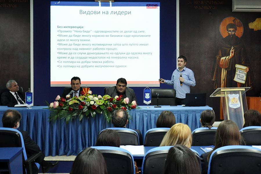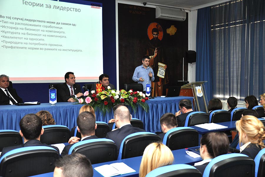 Гостите-предавачи најнапред ги преставија Проректорот за настава при Универзитетот за туризам и менаџмент, Проф. Д-р Мијалче Ѓеоргиевски, и Проректорот за меѓународна соработка Проф. Д-р Зоран Ивановски, по што советникот за анализа на пазарот Владимир Ристовски го започна своето предавање со претходно направена и добро концепирана презентација на темата. Тој во своето обраќање кон студентите најнапред го дефинираше поимот лидерството, односно што тоа значи и какви видови на лидерство и лидери постојат, но истовремено објаснувајќи ги и факторите кои влијаат врз стилот на лидерството. Според него успешен лидер е оној кој има способност да дава насоки на други луѓе, но уште повеќе е оној кој има способност да ги убеди луѓето да превземат некоја акција. Иако не го изоставува фактот дека постојат лидери кои едноставно имаат вродена харизма за сето тоа, сепак, според Ристовски лидерот, не се раѓа, туку се создава преку научената теорија и соодветната пракса низ годините. За ова свое тврдење тој посочи неколку примери на личности кои денес важат за успешни менаџери и лидери во светот.